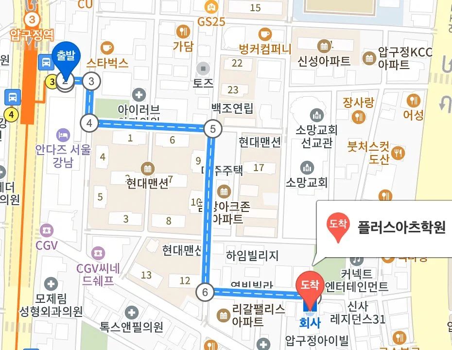 오시는 길: 지하철 3호선 압구정역 3번출구 도보 7분 (448m)[지도를 클릭하시면 카카오맵으로 연결됩니다]